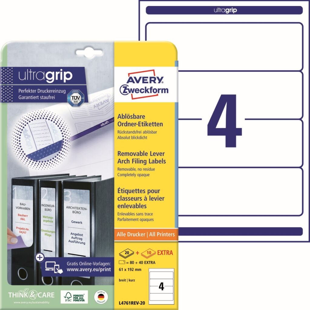 Snímatelné etikety na pořadače Avery Zweckform L4761REV-20 dodají Vaší kanceláři nebo domácí pracovně jednotný vzhled, strukturu a řád. Potištěné hřbety pořadačů vypadají profesionálně, zjednoduší práci a ušetří čas při hledání dokumentů. Krátký formát je vhodný pro široké pořadače značek Leitz, Elba, Falken, Mehle, Bene, Biella atd. Etikety jsou 100% zcela neprůhledné a kompletně zakryjí starý text nebo etiketu. Etikety se snímatelným lepidlem spolehlivě a bezpečně drží, a naopak je lze snadno odlepit, bez zanechání žádných stop zbytkového lepidla. Ukázka viz 1. Video (záložka výše). Novinka! Unikátní výrobní technologie Ultragrip – do oblasti záhlaví, zápatí a na boční okraje zadní strany archu s etiketami aplikovaná jemná vrstva laku a 3D strukturovaný povrch, který společně s vyznačenými okraji a vodícími linkami zaručí bezchybné natažení archu do tiskárny a absolutně přesný tisk bez rizika uvíznutí archu v tiskárně. Ukázka viz 2. Video (záložka výše). Při tisku se můžete spolehnout na čtyřstranný bezpečnostní okraj QCT (Quattro Clean Technology), který zabraňuje vytékání a usazování lepidla v tiskárně a ostrý tiskový výstup, který se díky vynikajícímu ukotvení tonerového prášku nebo inkoustu nerozmazává. Bezproblémový provoz laserových tiskáren testován a potvrzen certifikátem TÜV SÜD. Odnímatelné štítky na pořadače Avery Zweckform L4761REV-20 jsou vhodné pro všechny běžné laserové i inkoustové tiskárny, kopírovací stroje a hodí se i pro psaní, resp. ruční popis.