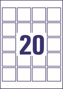 rozměr 45×45 mm, 25 archů A4, 500 ks etiket v balení (20 ks/arch), papírové, permanentní lepidlo, barva bílá. Typ tiskárny: černobílá laserová, barevná laserová, inkoustová.