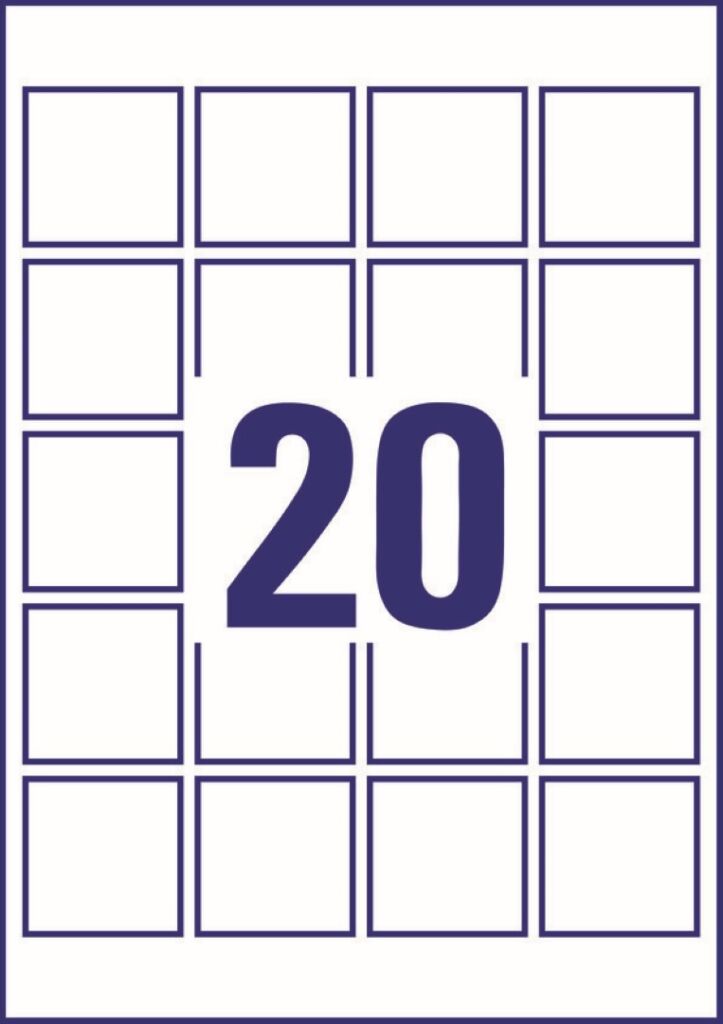 25 archů A4, rozměr 45x45 mm, 500 ks etiket v balení, papírové, neprůhledné, permanentní lepidlo, barva bílá. Typ tiskárny: černobílá laserová, barevná laserová, inkoustová.