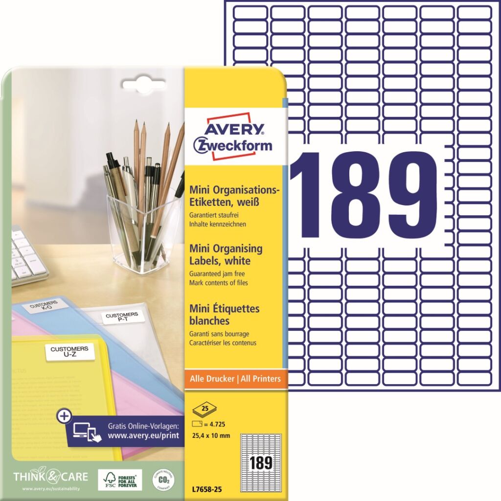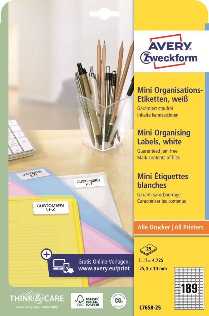 Samolepící mini etikety Avery Zweckform L7658-25 pro přehledné značení v kanceláři, obchodě i domácnosti. Ideální pro označování a organizaci dokumentů, složek, organizérů, zásuvek atp. Spolehlivá a stálá lepivost na různých typech povrchů. Při tisku se můžete spolehnout na plynulý průjezd archů tiskárnou bez uvíznutí a ostrý tiskový výstup, který se díky vynikajícímu ukotvení tonerového prášku či inkoustu nerozmazává. Samozřejmostí je čtyřstranný bezpečnostní okraj QCT (Quattro-Clean-Technology), který zabraňuje vytékání a usazování lepidla v tiskárně. Samolepící štítky na složky Avery Zweckform L7658-25 jsou vhodné pro všechny běžné laserové i inkoustové tiskárny, kopírovací stroje a hodí se i pro psaní, resp. ruční popis.