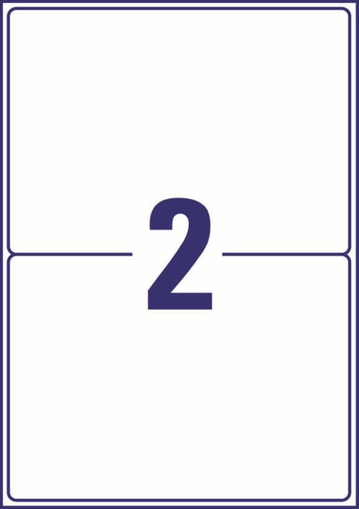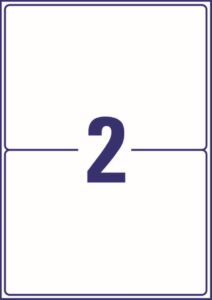 rozměr 199,6×143,5 mm, 100 archů A4, 200 ks etiket v balení (2 ks/arch), papírové, neprůhledné, permanentní lepidlo, barva bílá. Typ tiskárny: černobílá laserová, barevná laserová.