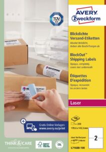 Etikety na zásilky Avery Zweckform L7168B-100 do kanceláře, obchodu i domácnosti, ideální jako adresní etikety, štítky na balíky, přepravní etikety pro přepravní společnosti apod. Extra silný materiál etiket s vysokou lepivostí na běžných površích jako papír, karton, sklo a plast. Etikety jsou vyrobeny s technologií BlockOut™ – zcela neprůhledné – kompletně zakryjí starý text nebo etiketu. Díky praktické pomůcce QuickPEEL™ můžete jednotlivé etikety odlepovat z archu snadno a rychle. Při tisku se můžete spolehnout na plynulý průjezd archů tiskárnou bez uvíznutí a ostrý tiskový výstup, který se díky vynikajícímu ukotvení tonerového prášku nerozmazává. Samozřejmostí je čtyřstranný bezpečnostní okraj QCT (Quattro-Clean-Technology), který zabraňuje vytékání a usazování lepidla v tiskárně. Bezproblémový provoz laserových tiskáren testován a potvrzen certifikátem TÜV SÜD. Bílé samolepící štítky na zásilky Avery Zweckform L7168B-100 jsou vhodné pro všechny běžné černobílé i barevné laserové tiskárny.