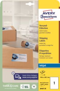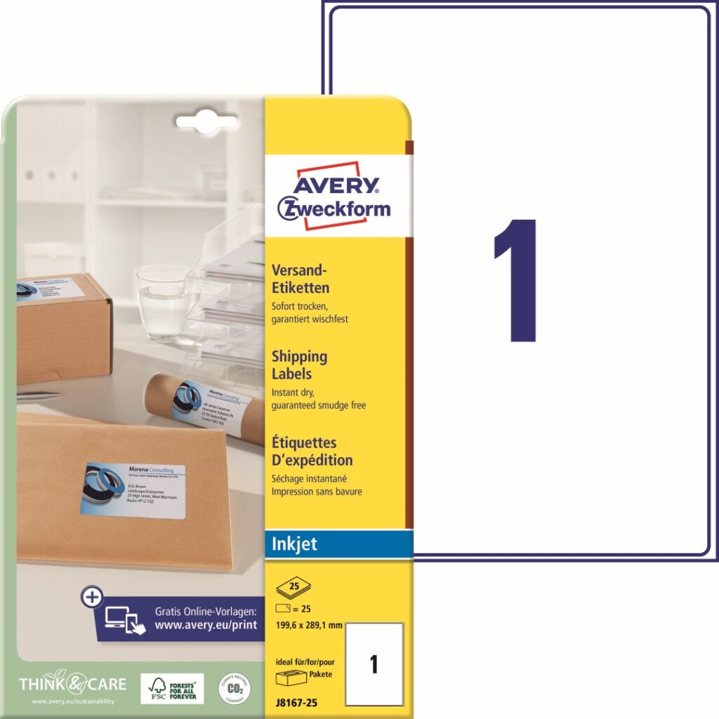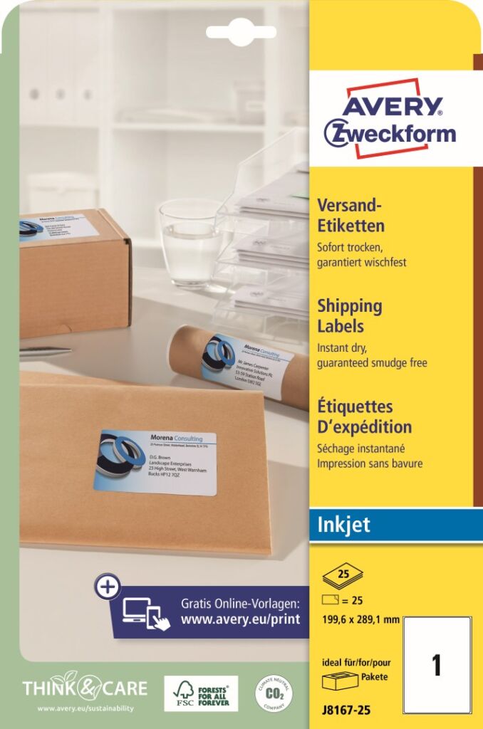 Inkjet etikety na balíky Avery Zweckform J8167-25 do kanceláře, obchodu i domácnosti, ideální jako adresní etikety, štítky na zásilky, přepravní štítky pro přepravní společnosti apod. Etikety jsou vyrobeny se speciální rychleschnoucí povrchovou úpravou QuickDry™. Vysoká lepivost na běžných površích jako papír, karton, sklo a plast. Při tisku se můžete spolehnout na plynulý průjezd archů tiskárnou bez uvíznutí a ostrý tiskový výstup, který se díky vynikajícímu přilnutí inkoustu nerozmazává. Samozřejmostí je čtyřstranný bezpečnostní okraj QCT (Quattro Clean Technology), který zabraňuje vytékání a usazování lepidla v tiskárně. Arch má ze zadní strany tzv. split, což je násek nosného papíru pro snadnější sejmutí etikety. Bílé samolepící adresní štítky Avery Zweckform J8167-25 jsou vhodné pro všechny běžné inkoustové tiskárny.