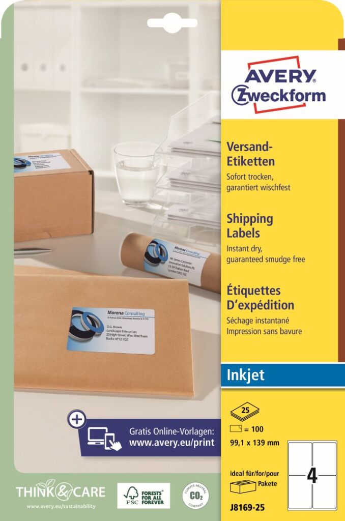 Inkjet etikety na balíky Avery Zweckform J8169-25 do kanceláře, obchodu i domácnosti, ideální jako adresní etikety, štítky na zásilky, přepravní štítky pro přepravní společnosti apod. Etikety jsou vyrobeny se speciální rychleschnoucí povrchovou úpravou QuickDry™. Vysoká lepivost na běžných površích jako papír, karton, sklo a plast. Při tisku se můžete spolehnout na plynulý průjezd archů tiskárnou bez uvíznutí a ostrý tiskový výstup, který se díky vynikajícímu přilnutí inkoustu nerozmazává. Samozřejmostí je čtyřstranný bezpečnostní okraj QCT (Quattro Clean Technology), který zabraňuje vytékání a usazování lepidla v tiskárně. Bílé samolepící adresní štítky Avery Zweckform J8169-25 jsou vhodné pro všechny běžné inkoustové tiskárny.