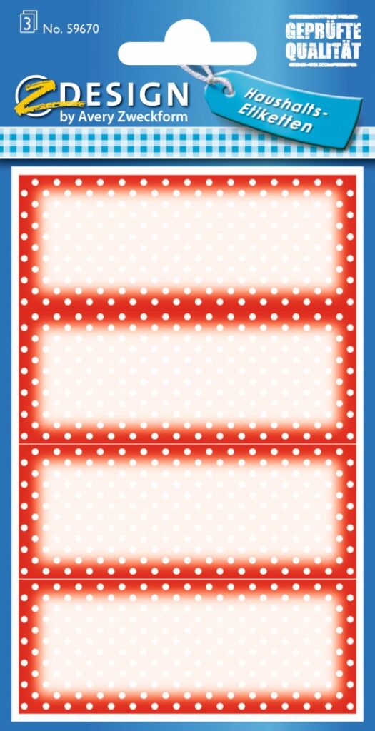 Vylepšete domácí marmelády, kompoty, nakládanou zeleninu či další pochutiny stylovými etiketami Z-design od Avery Zweckform. Tak jako tak musíte skleničky označit, aby jste nezapomněli datum výroby, tak proč to neudělat hravě. Určitě naleznete i další způsoby využití. Označení dóz od cukru, mouky či koření v barvě kuchyně, jistě zútulní Váš domov. Jako léty osvědčený expert na samolepící etikety nabízíme velký výběr praktických etiket pro domácnost. Všechny můžete jednoduše popsat – obsah balení, datum spotřeby apod. Etikety lze navíc velice jednoduše odlepit aniž by na podkladu zanechávaly zbytky po lepidle. Samolepící etikety na zavařeniny Avery Zweckform 59670 nabízí prvotřídní a prověřenou kvalitu, vyzkoušejte je!