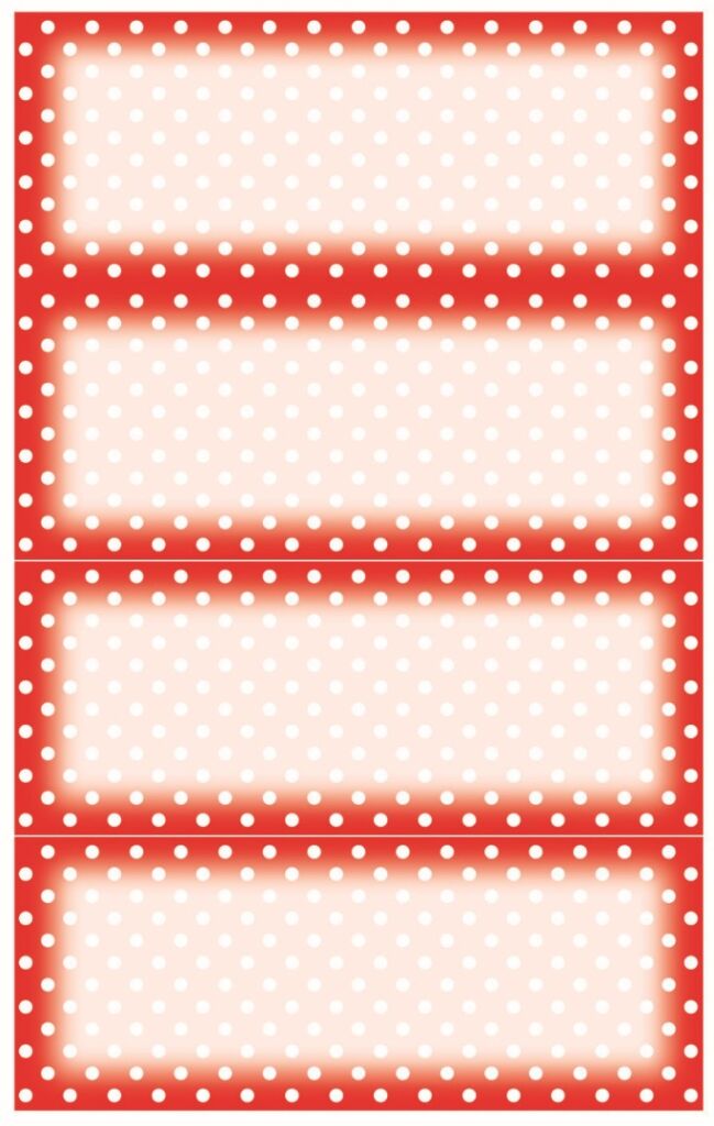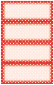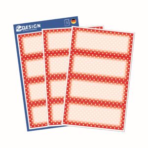 Rozměr 70×26 mm, 12 ks etiket v balení, papírové, snímatelné lepidlo, motiv červené rámečky. Balení obsahuje 3 stejné aršíky vyobrazených samolepek.