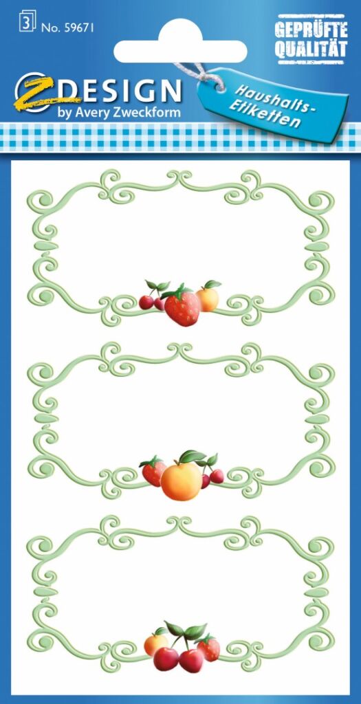 Vylepšete domácí marmelády, kompoty, nakládanou zeleninu či další pochutiny stylovými etiketami Z-design od Avery Zweckform. Tak jako tak musíte skleničky označit, aby jste nezapomněli datum výroby, tak proč to neudělat hravě. Určitě naleznete i další způsoby využití. Označení dóz od cukru, mouky či koření v barvě kuchyně, jistě zútulní Váš domov. Jako léty osvědčený expert na samolepící etikety nabízíme velký výběr praktických etiket pro domácnost. Všechny můžete jednoduše popsat – obsah balení, datum spotřeby apod. Etikety lze navíc velice jednoduše odlepit aniž by na podkladu zanechávaly zbytky po lepidle. Samolepící etikety na zavařeniny Avery Zweckform 59671 nabízí prvotřídní a prověřenou kvalitu, vyzkoušejte je!