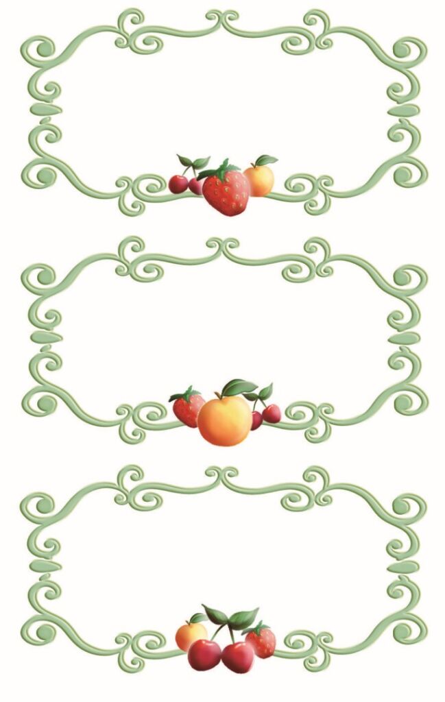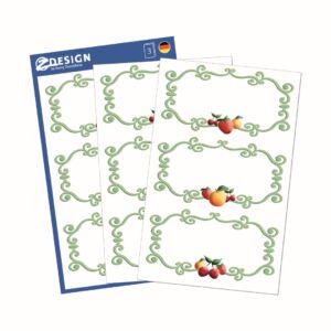 Rozměr 70×35 mm, 9 ks etiket v balení, papírové, snímatelné lepidlo, motiv zelené rámečky s ovocem. Balení obsahuje 3 stejné aršíky vyobrazených samolepek.