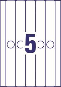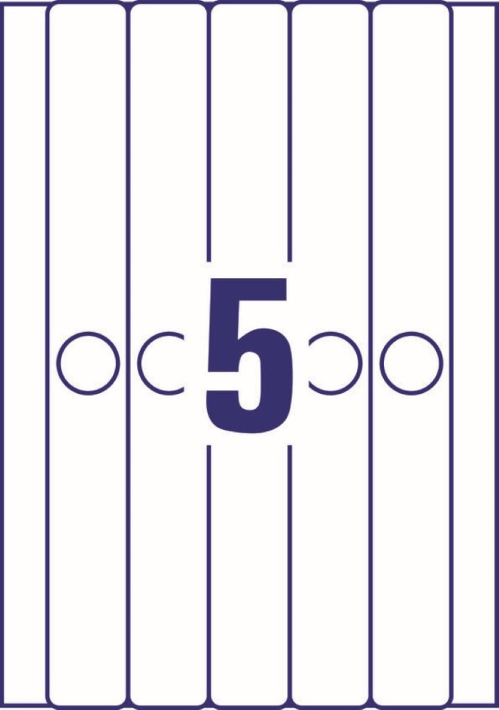 rozměr 34×297 mm, 25 archů A4, 125 ks etiket v balení (5 ks/arch), papírové, permanentní lepidlo, barva bílá. Typ tiskárny: černobílá laserová, barevná laserová, inkoustová.