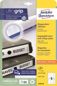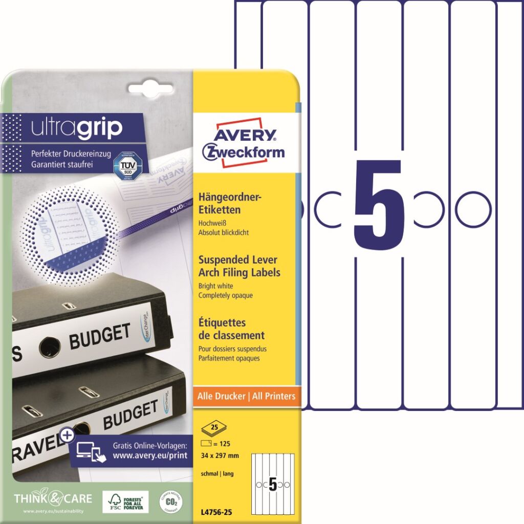 Samolepící etikety na závěsné pořadače Avery Zweckform L4756-25 dodají Vaší kanceláři jednotný vzhled, strukturu a řád. Potištěné hřbety závěsných pořadačů vypadají profesionálně, zjednoduší práci a ušetří čas při hledání dokumentů. Dlouhý formát je vhodný pro úzké závěsné pořadače značek Leitz, Elba, Falken atd. Etikety jsou 100% zcela neprůhledné a kompletně zakryjí starý text nebo etiketu. Novinka! Unikátní výrobní technologie Ultragrip – do oblasti záhlaví, zápatí a na boční okraje zadní strany archu s etiketami aplikovaná jemná vrstva laku a 3D strukturovaný povrch, který společně s vyznačenými okraji a vodícími linkami zaručí bezchybné natažení archu do tiskárny a absolutně přesný tisk bez rizika uvíznutí archu v tiskárně. Ukázka viz 2. Video (záložka výše). Při tisku se můžete spolehnout na čtyřstranný bezpečnostní okraj QCT (Quattro Clean Technology), který zabraňuje vytékání a usazování lepidla v tiskárně a ostrý tiskový výstup, který se díky vynikajícímu ukotvení tonerového prášku nebo inkoustu nerozmazává. Bezproblémový provoz laserových tiskáren testován a potvrzen certifikátem TÜV SÜD. Samolepící štítky na závěsné pořadače Avery Zweckform L4756-25 jsou vhodné pro všechny běžné laserové i inkoustové tiskárny, kopírovací stroje a hodí se i pro psaní, resp. ruční popis.