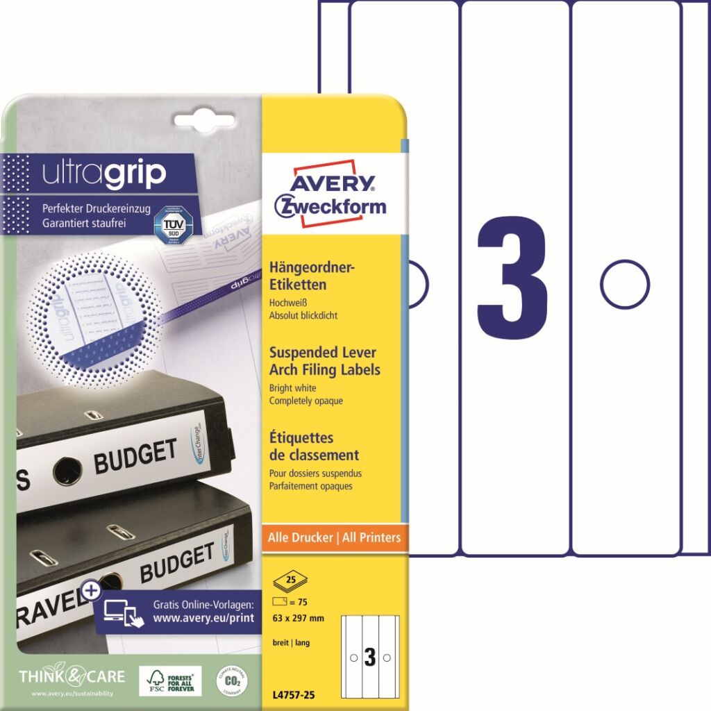 Samolepící etikety na závěsné pořadače Avery Zweckform L4757-25 dodají Vaší kanceláři jednotný vzhled, strukturu a řád. Potištěné hřbety závěsných pořadačů vypadají profesionálně, zjednoduší práci a ušetří čas při hledání dokumentů. Dlouhý formát je vhodný pro široké závěsné pořadače značek Leitz, Elba atd. Etikety jsou 100% zcela neprůhledné a kompletně zakryjí starý text nebo etiketu. Novinka! Unikátní výrobní technologie Ultragrip – do oblasti záhlaví, zápatí a na boční okraje zadní strany archu s etiketami aplikovaná jemná vrstva laku a 3D strukturovaný povrch, který společně s vyznačenými okraji a vodícími linkami zaručí bezchybné natažení archu do tiskárny a absolutně přesný tisk bez rizika uvíznutí archu v tiskárně. Ukázka viz 2. Video (záložka výše). Při tisku se můžete spolehnout na čtyřstranný bezpečnostní okraj QCT (Quattro Clean Technology), který zabraňuje vytékání a usazování lepidla v tiskárně a ostrý tiskový výstup, který se díky vynikajícímu ukotvení tonerového prášku nebo inkoustu nerozmazává. Bezproblémový provoz laserových tiskáren testován a potvrzen certifikátem TÜV SÜD. Samolepící štítky na závěsné pořadače Avery Zweckform L4757-25 jsou vhodné pro všechny běžné laserové i inkoustové tiskárny, kopírovací stroje a hodí se i pro psaní, resp. ruční popis.
