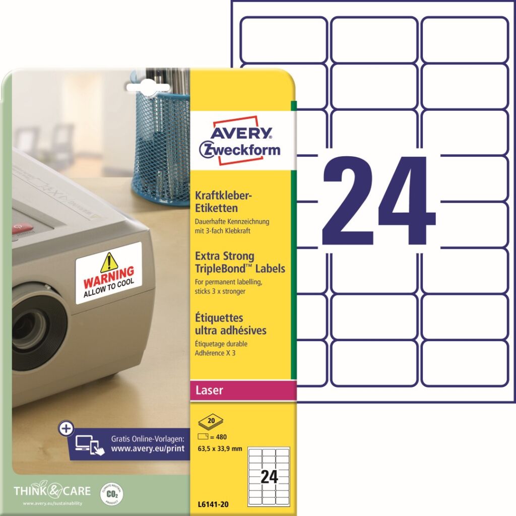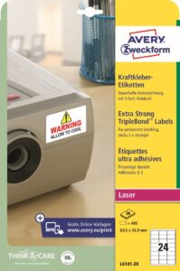Super lepivé PET etikety Avery Zweckform L6141-20 zaručeně drží třikrát silněji než ostatní běžné etikety a proto se skvěle hodí pro stálé a dlouhodobé vnitřní i venkovní značení. Ideální na materiály jako kov nebo plast. Spolehlivá přilnavost i na “obtížných“, např. teplých, studených nebo hrubších površích. Etikety jsou trvanlivé, odolné vůči stříkající vodě, nečistotám, mastnotě, roztržení, UV záření a teplotám od -40°C do +100°C. Při tisku se můžete spolehnout na plynulý průjezd archů tiskárnou bez uvíznutí a ostrý tiskový výstup, který se díky vynikajícímu ukotvení tonerového prášku nerozmazává. Samozřejmostí je čtyřstranný bezpečnostní okraj QCT (Quattro Clean Technology), který zabraňuje vytékání a usazování lepidla v tiskárně. Samolepící štítky s trojnásobnou lepivostí Avery L6141-20 jsou vhodné pro všechny běžné černobílé i barevné laserové tiskárny.