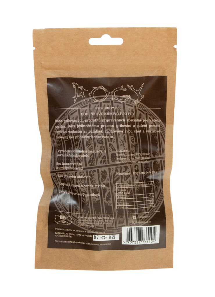 Hovězí s bachorem a kolagenovou chrupavkou na grilu. Díky jedinečnému procesu grilování a následnému sušení teplým vzduchem si tato pochoutka zachovává svou vůni a nutriční hodnotu bez nutnosti přidávání konzervačních látek. Přidání vlákniny a lněného semínka prospívá trávicímu systému a trávení.