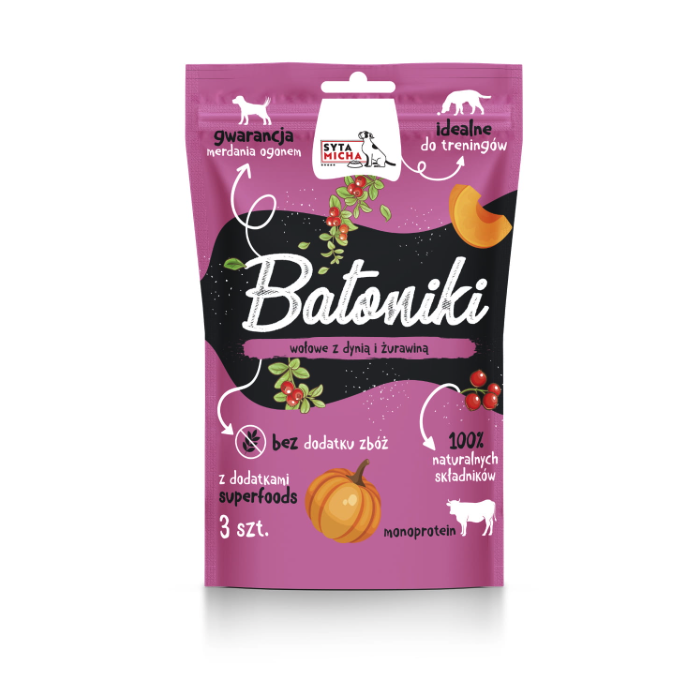 Hovězí tyčinky s dýní a brusinkami od Syta Micha jsou obdélníkové pamlsky o délce 8 cm, které zkrátí vašemu mazlíčkovi dlouhou chvíli. Zdravá odměna bez umělých přísad a konzervantů je skvělá pro štěňata, dospělé i psí seniory. Hodí se i pro všechny plemena, pro malé pejsky může navíc fungovat jako žvýkací hračka.