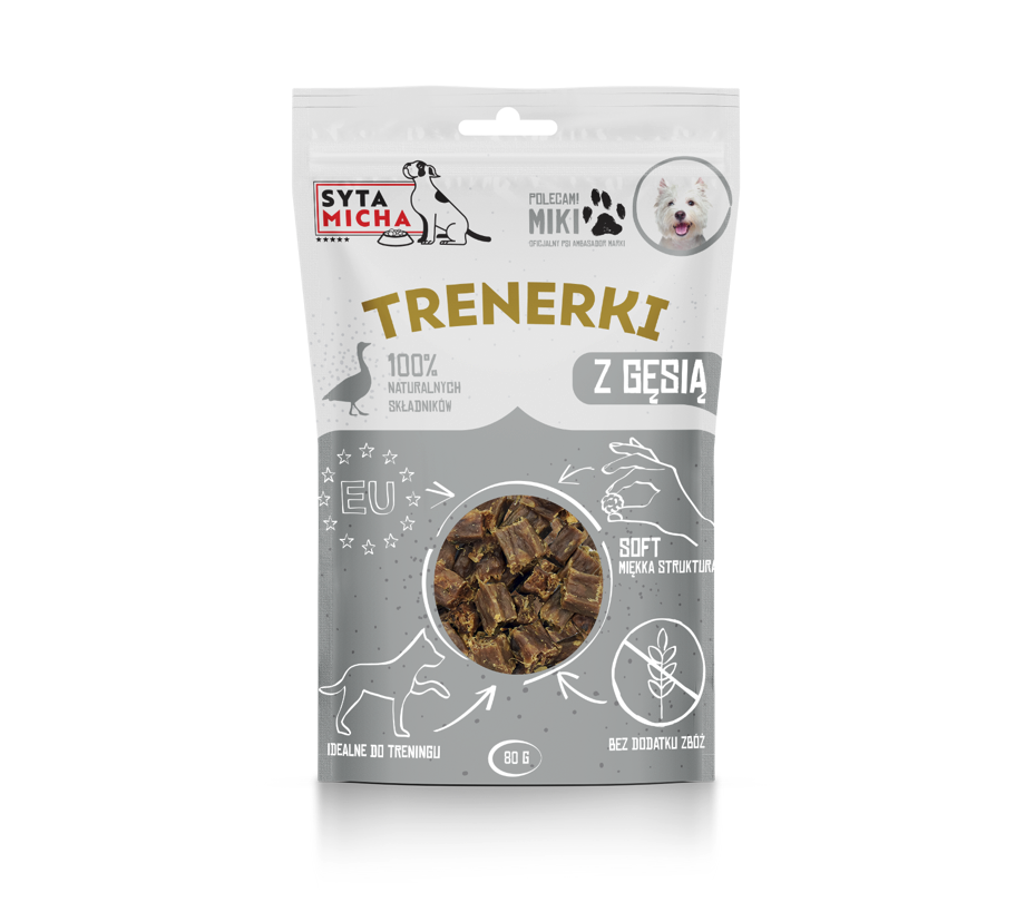 Husí tréninkové pamlsky uspokojí tlamičky všech plemen, navíc v nich nenajdete nic než poctivé husí maso (a drobítek rostlinného glycerinu). V husím mase najdete třikrát více vitamínu B12 a dvakrát vitamínu B6 než v jeho kuřecí konkurenci. Měkká konzistence je ideální i pro pejsky, kterým nezbylo moc zoubků. Má vysoký obsah železa a zinku, takže významně posiluje imunitu. Přibalte na cesty i cvičák tréninkové mini pamlsky!