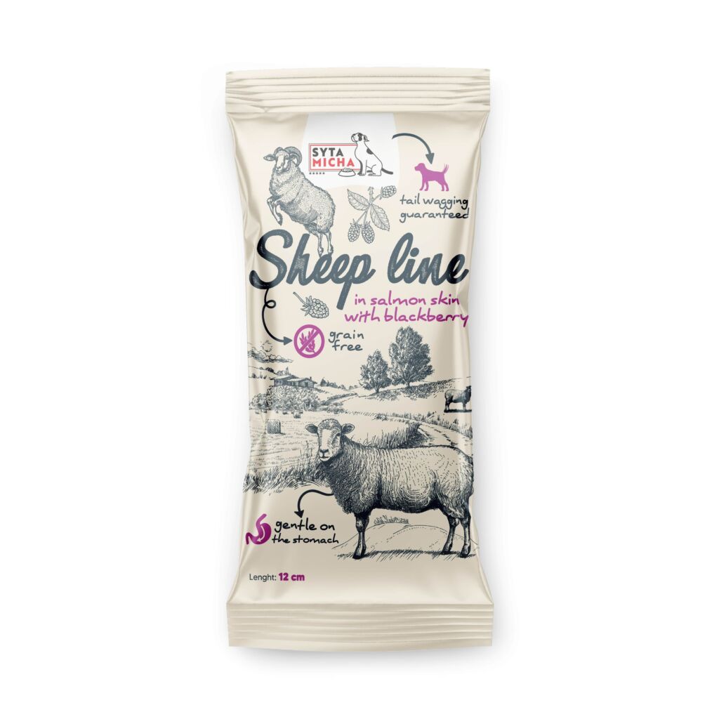 Řada kostiček Sheep line navržená tak, aby psovi poskytla potřebné živiny a důkladným žvýkáním přinesla klid na duši. Tyto psí pochoutky jsou vyrobeny z nezpracovaných komponent a těmi není nic jiného než ovčí kůže, lososová kůže, dýně, ostružiny, biotin a zinek.