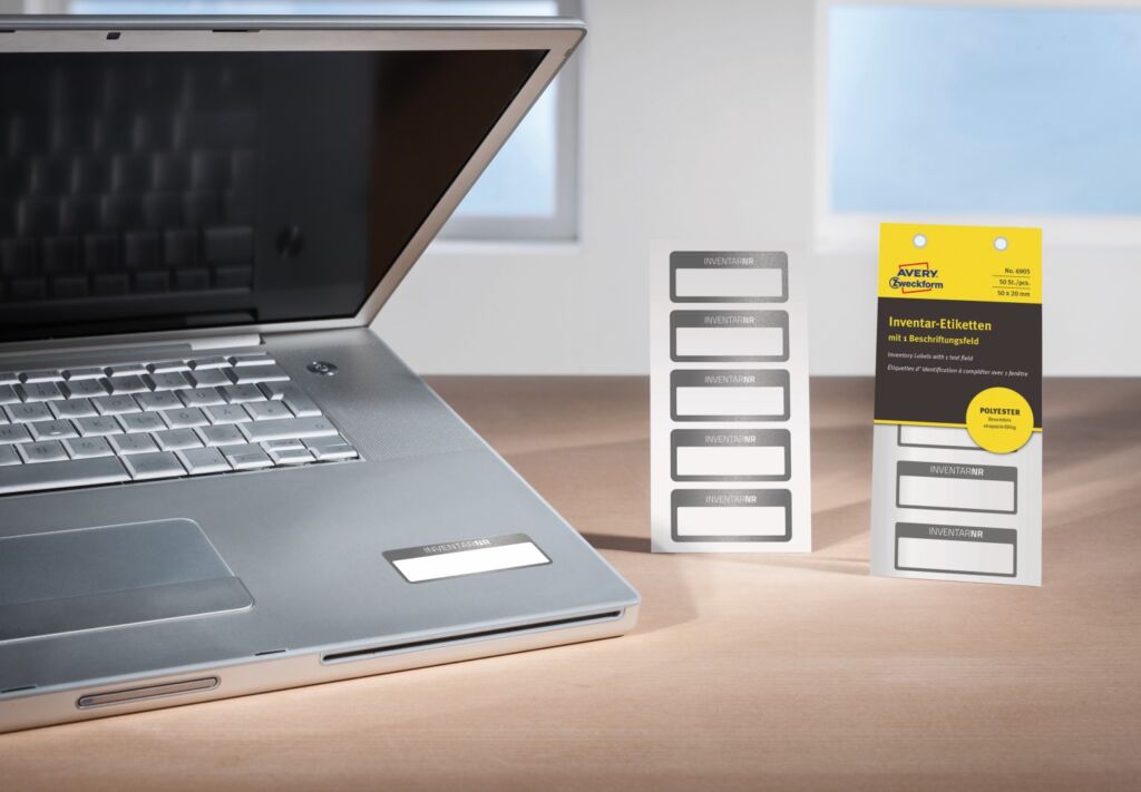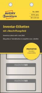 Inventární štítky na ruční popis Avery Zweckform 6905 pro bezpečné a profesionální označení majetku. Pomocí speciálně vyvinutých, obzvláště odolných štítků z matně stříbrné samolepící polyesterové fólie, nejen na trvalé označení inventáře a majetku, ale i pro skladování a inventarizaci. Inventarizační štítky jsou vhodné do extrémních podmínek. protože jsou odolné vůči stříkající vodě, nečistotám, mastnotě, čistícím a desinfekčním prostředkům, rozpouštědlům, roztržení a teplotám od -40°C do +150°C. Samolepící štítky pro označení inventáře Avery 6905 jsou baleny v praktickém bločku a lze je tak používat snadno a rychle přímo na místě. Jednoduché značení pomocí permanentního popisovače nebo kuličkového pera.