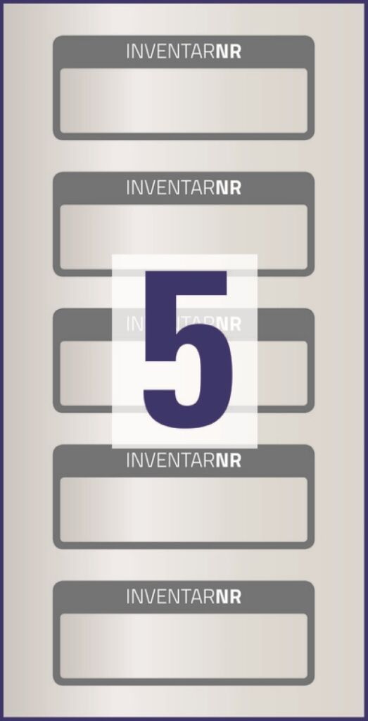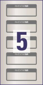 rozměr 50x20 mm, 50 ks etiket v balení, odolná samolepící PET fólie, barva matná stříbrná s černým rámečkem, nápisem INVENTARNR a jedním textovým polem.