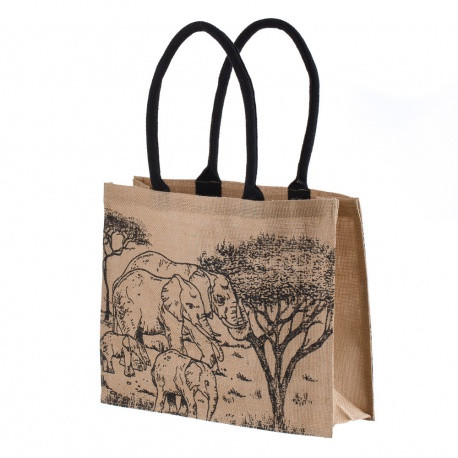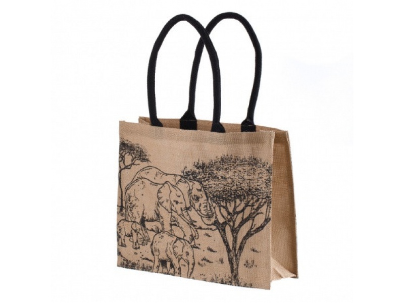 Prostorná jutová taška s obrázkem sloní rodiny.