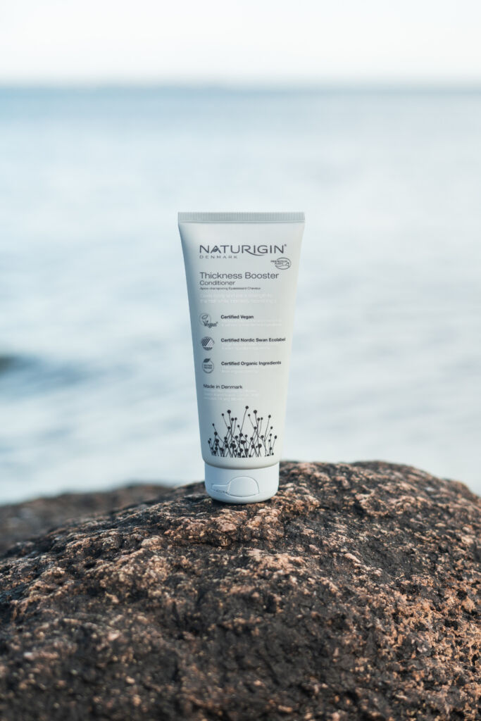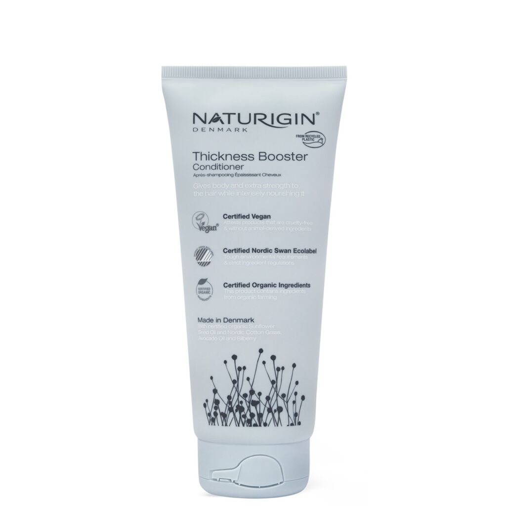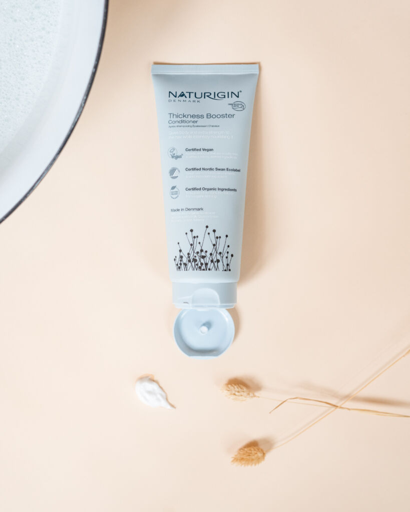 Dánská přírodní kosmetika NATURIGIN neobsahuje SLS, parabeny ani amoniak. Přírodní BIO ingredience pocházejí z certifikovaných zdrojů. Kondicionér Thickness Booster Conditioner získal certifikaci Nordic Swan Ecolabel, logo Vegan a certifikaci Certified Organic Ingredients.
