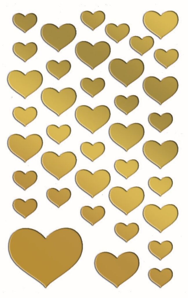 78 ks samolepek v balení, fóliové, permanentní lepidlo, motiv srdce. Balení obsahuje 2 stejné aršíky vyobrazených samolepek.