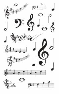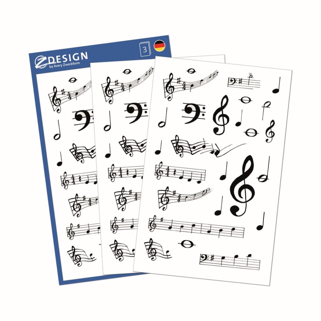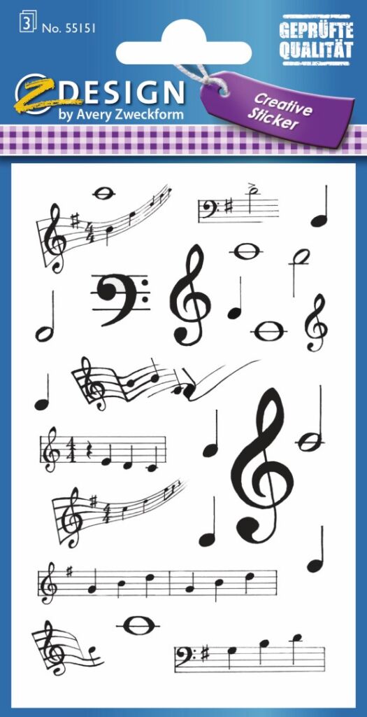 75 ks samolepek v balení, papírové, permanentní lepidlo, motiv hudební noty. Balení obsahuje 3 stejné aršíky vyobrazených samolepek.