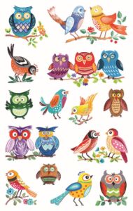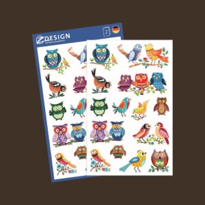 28 ks samolepek v balení, papírové, permanentní lepidlo, motiv sovy. Balení obsahuje 2 stejné aršíky vyobrazených samolepek.