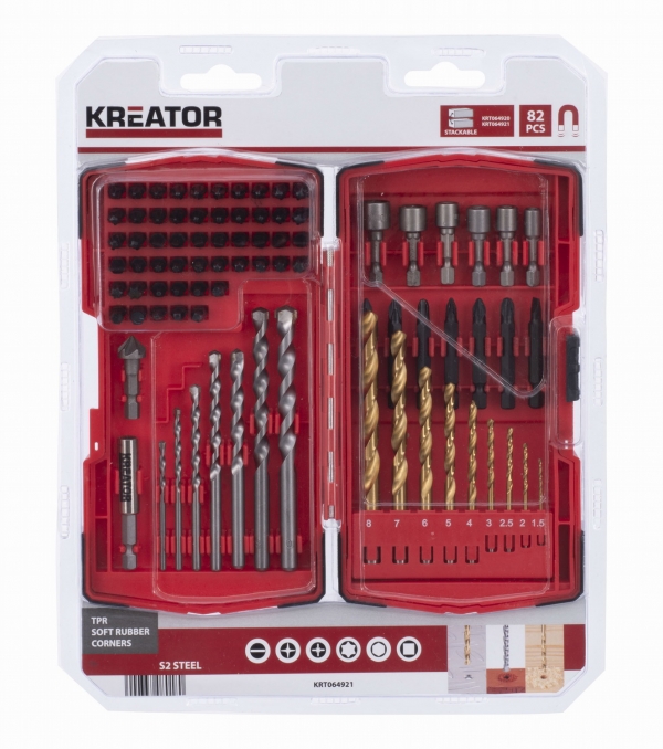 V této 82dílné sadě vrtáků a šroubovacích bitů najdete nepochybně to správné příslušenství pro všechny vaše vrtačky a šroubováky: PH bity, PZ bity, T bity, v různých velikostech, držáky bitů, vrtáky do dřeva a kovu, nástrčné klíče….. Sada je dodávána v praktickém pouzdru s pogumovanými rohy o rozměru 193x113x53 mm.