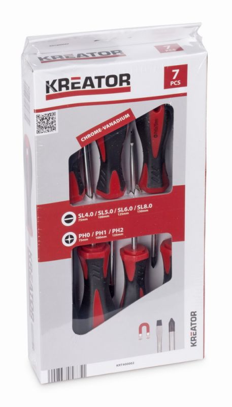 Sada šroubováků 7ks SL/PH. Plochý: 4.0 (75 mm) 5.0 (100mm) 6.0 (125 mm) 7.0 (150 mm) Philips: PH0 (75 mm) PH1 (100mm) PH2 (125 mm) Magnetický černý hrot, Materiál - Chrome vanadium...