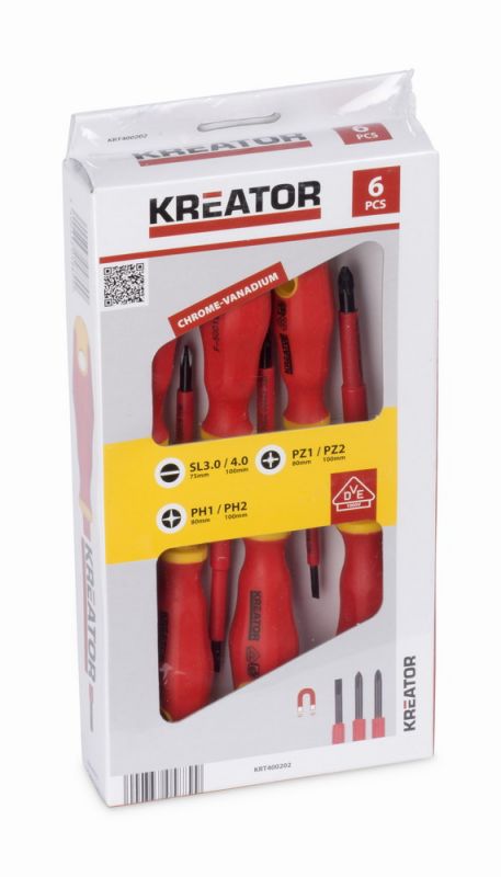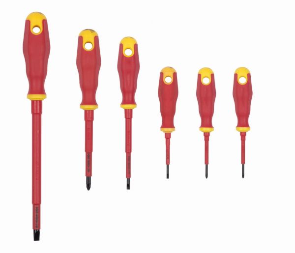 Sada elektrikářských šroubováků 6ks VDE. Plochý: 3.0 (75 mm) 4.0 (100 mm) Philips: PH1 (80 mm) PH2 (100 mm) Pozidriv: PZ1 (80 mm) PZ2 (100 mm), Materiál - Chrome vanadium...