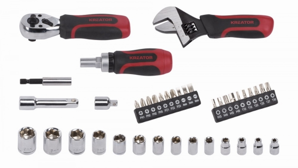 Ráčnová sada 40ks 1/4" , 3/8". 10x nástrčná hlavice 1/4 DIN 3124 4 / 4.5 / 5 / 6 / 7 / 8 / 9 / 10 / 11 / 12mm 4x nástrčná hlavice 3/8 13 / 14 / 15 / 16mm 20x bity Ploché: 4.0, 5.0, 6.0 Philips: PH1, PH2, PH3 Pozidriv: PZ1, PZ2, PZ3 Torx: T10, T15, T20, T25, T27, T30 Hex: 3, 4 ,5,...
