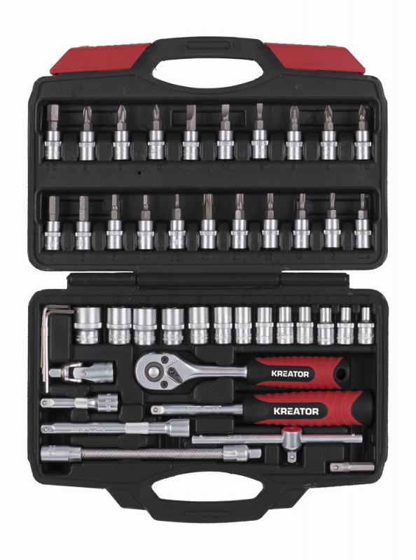 13x nástrčná hlavice 1/4 DIN 31244 / 4.5 / 5 / 5.5 / 6 / 7 / 8 / 9 / 10 / 11 / 12 / 13 / 14 mm21x bitů 1/4Ploché: 4.0, 5.5, 7.0Philips: PH1, PH2, PH3Pozidriv: PZ1, PZ2, PZ3Torx: T10, T15, T20, T25, T30, T40Hex: 3, 4 ,5, 6, 7, 8Flexibilní nástavec 150 mm30 mm hex adapter, kardanův kloubNástavec 50 a 100 mm72T ráčna 1/44x hex klíče1.27 / 1.5 / 2.0 / 2.5 mm