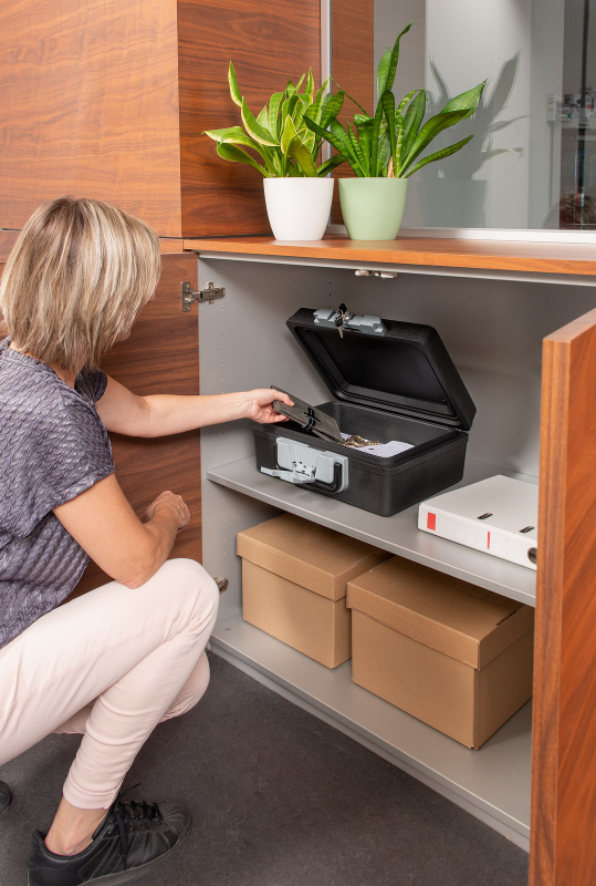 Tento praktický trezor KRT692005 od společnosti Kreator měří 390 x 335 x 160 mm a poskytuje dostatek prostoru pro bezpečné uložení všech druhů cenností. Díky kompaktní konstrukci jej lze snadno uložit téměř do jakékoli skříně. Robustní trezor je vyroben ze zlepšených ohnivzdorných materiálů, proto vydrží teploty 842 stC až 30 minut. Tento trezor je také vodotěsný. Se skládací ergonomickou rukojetí lze trezor snadno přepravovat. Zámek na klíče se dvěma klíči zajišťuje, že všechny cennosti zůstanou bezpečně uzamčeny.