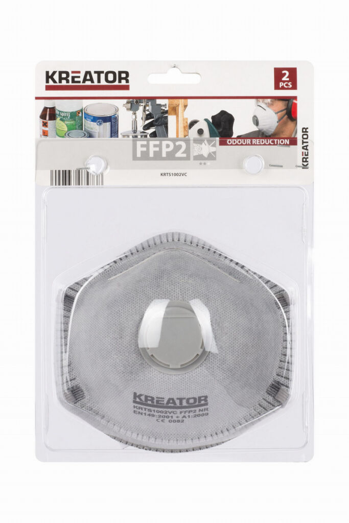 Respirátor FFP2 2 ks VC s redukcí zápachu. Tento respirátor KRTS1002VC třídy FFP2 s redukcí zápachu a výdechovým ventilem poskytuje ochranu proti netoxickým tuhým a kapalným částicím (např. olejové mlhy). Filtrace nejméně 94procent vzdušných částic....