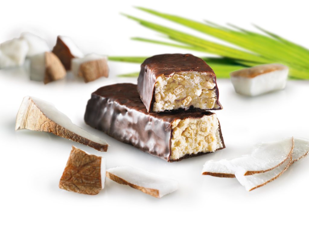 Směs bílkovin (izolované sójové bílkoviny, mléčné bílkoviny), poleva, cukr, odtučněné mléko v prášku, nízkotučné kakao v prášku, bezvodé máslo, emulgátor: sójový lecitin, aromata, polydextróza, fruktooligosacharidy, stabilizátory: glycerol, sorbitol a fosforečnan draselný, rostlinné oleje, strouhaný kokos 1,2%, aroma, glukózový sirup, L-methionin, regulátor kyselosti: kyselina citrónová, antioxidanty: kyselina askorbová, extrakt z rozmarýnu, sójové tokoferoly a estery mastných kyselin