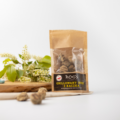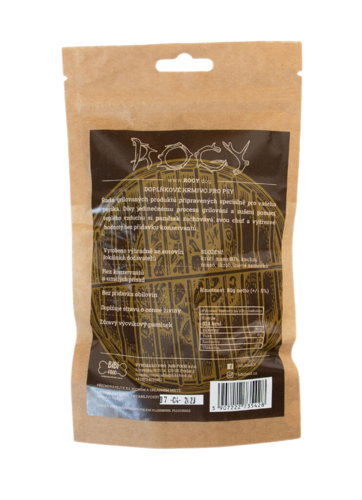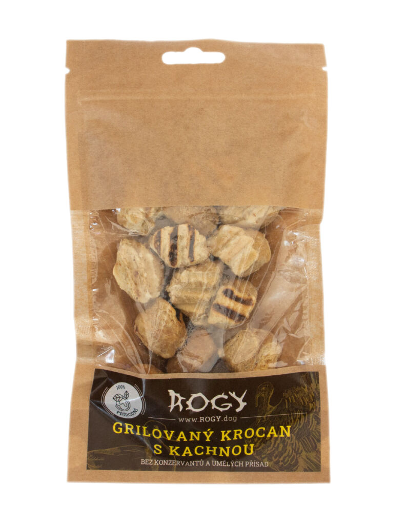 Krůta s kachnou na grilu. Díky jedinečnému procesu grilování a následnému sušení teplým vzduchem si tato pochoutka zachovává svou vůni a nutriční hodnotu bez nutnosti přidávání konzervačních látek. Přidání vlákniny a lněného semínka prospívá trávicímu systému a trávení.