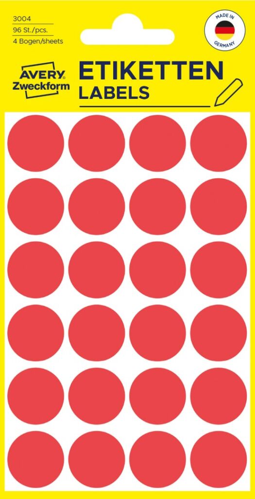 Samolepící kolečka Avery Zweckform 3004 na jednoduché, rychlé a poutavé označování, plánování, archivaci, organizaci, inventarizaci atd. Skvěle se hodí například pro plánování rozvrhů, směn nebo dovolených, označování konkrétních výrobků či dokumentů, kontrolu kvality nebo inventarizaci apod. Jsou okamžitě viditelné a umožňují tak jasný a jednoduchý přehled. Za pomoci kulatých značkovacích etiket Vám půjde práce lépe od ruky. Spolehlivá lepivost na všech běžných typech povrchů. Červené samolepící etikety o průměru 18 mm Avery 3004 jsou ideální pro rychlé a snadné použití v kanceláři, obchodě nebo domácnosti, lze je také označit ručně, nejsou však vhodné pro potisk v tiskárnách. Kulaté samolepící etikety nabízíme v mnoha různých barevných i velikostních variantách pro velmi flexibilní použití.