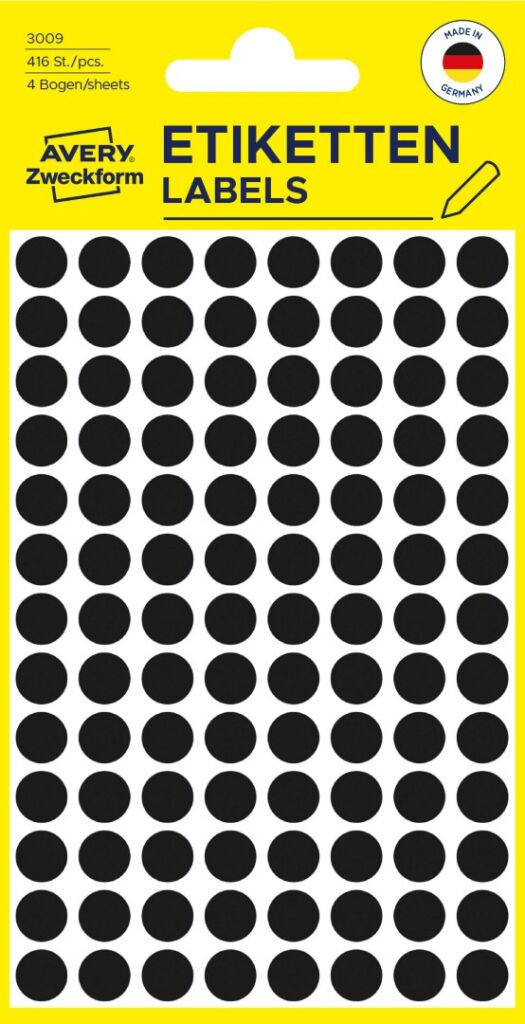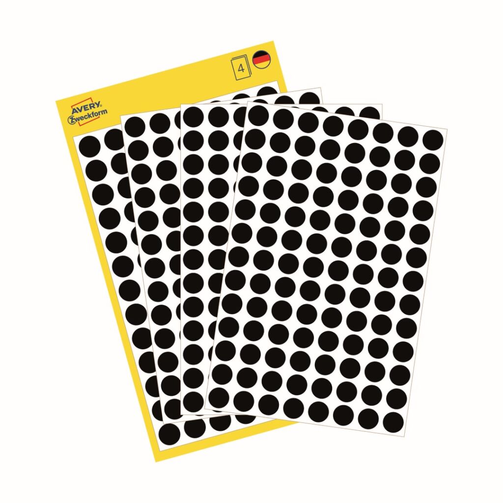 Samolepící kolečka Avery Zweckform 3009 na jednoduché a přehledné značení, uspořádávání, plánování, inventarizaci atd. Skvěle se hodí například pro plánování rozvrhů, směn nebo dovolených. Za pomoci kulatých značkovacích etiket Vám půjde práce lépe od ruky. Spolehlivá lepivost na všech běžných typech povrchů. Černé samolepící etikety o průměru 8 mm Avery 3009 jsou ideální pro rychlé a snadné použití doma nebo v kanceláři. Nabízíme v různých barvách a velikostech!
