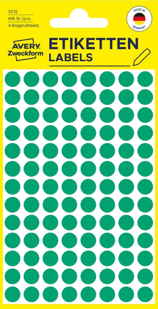 Samolepící kolečka Avery Zweckform 3012 na jednoduché a přehledné značení, uspořádávání, plánování, inventarizaci atd. Skvěle se hodí například pro plánování rozvrhů, směn nebo dovolených. Za pomoci kulatých značkovacích etiket Vám půjde práce lépe od ruky. Spolehlivá lepivost na všech běžných typech povrchů. Zelené samolepící etikety o průměru 8 mm Avery 3012 jsou ideální pro rychlé a snadné použití doma nebo v kanceláři. Nabízíme v různých barvách a velikostech!