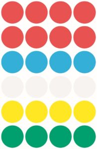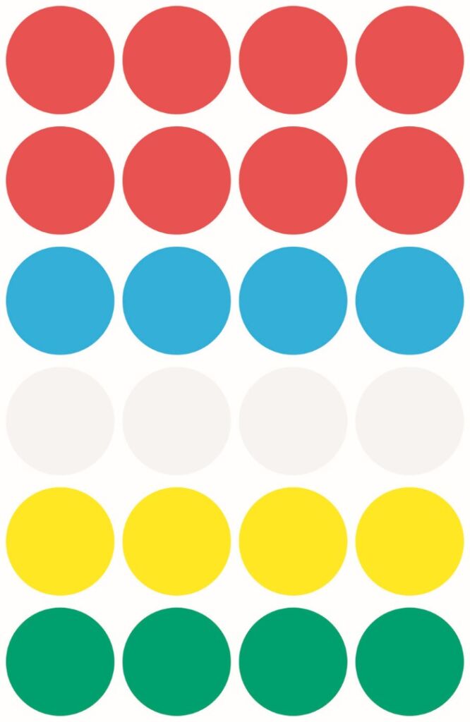 průměr 18 mm, 96 ks etiket v balení, papírové, permanentní lepidlo, mix barev: červená (32ks), modrá (16ks), bílá (16ks), žlutá (16ks), zelená (16ks).