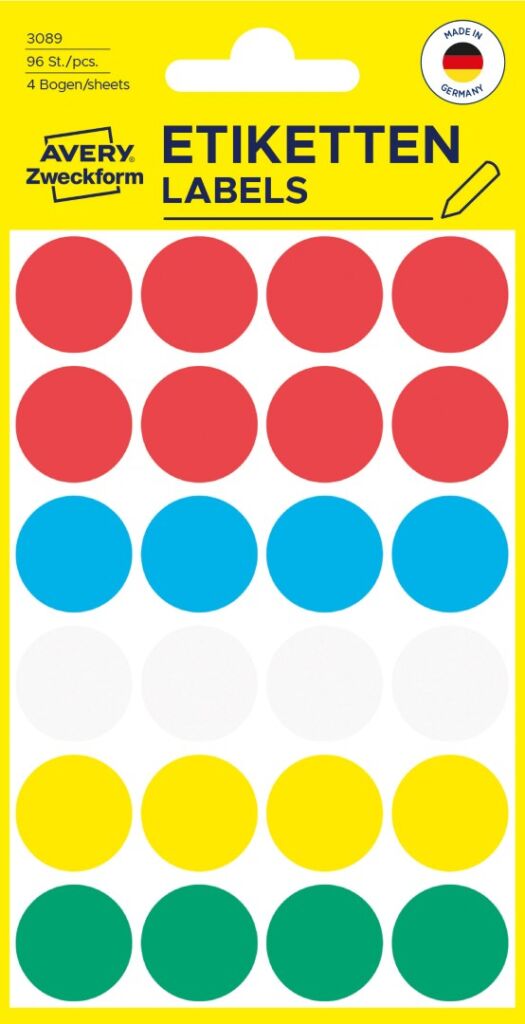 Samolepící kolečka Avery Zweckform 3089 na jednoduché a přehledné značení, uspořádávání, plánování, inventarizaci atd. Skvěle se hodí například pro plánování rozvrhů, směn nebo dovolených. Za pomoci kulatých značkovacích etiket Vám půjde práce lépe od ruky. Spolehlivá lepivost na všech běžných typech povrchů. Barevné samolepící etikety o průměru 18 mm Avery 3089 jsou ideální pro rychlé a snadné použití doma nebo v kanceláři. Nabízíme v různých barvách a velikostech!