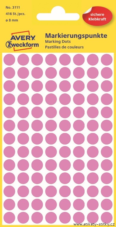 Samolepící kolečka Avery Zweckform 3111 na jednoduché a přehledné značení, uspořádávání, plánování, inventarizaci atd. Skvěle se hodí například pro plánování rozvrhů, směn nebo dovolených. Za pomoci kulatých značkovacích etiket Vám půjde práce lépe od ruky. Spolehlivá lepivost na všech běžných typech povrchů. Růžové samolepící etikety o průměru 8 mm Avery 3111 jsou ideální pro rychlé a snadné použití doma nebo v kanceláři. Nabízíme v různých barvách a velikostech!