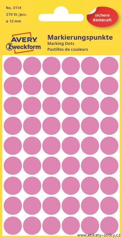 Samolepící kolečka Avery Zweckform 3114 na jednoduché a přehledné značení, uspořádávání, plánování, inventarizaci atd. Skvěle se hodí například pro plánování rozvrhů, směn nebo dovolených. Za pomoci kulatých značkovacích etiket Vám půjde práce lépe od ruky. Spolehlivá lepivost na všech běžných typech povrchů. Růžové samolepící etikety o průměru 12 mm Avery 3114 jsou ideální pro rychlé a snadné použití doma nebo v kanceláři. Nabízíme v různých barvách a velikostech!