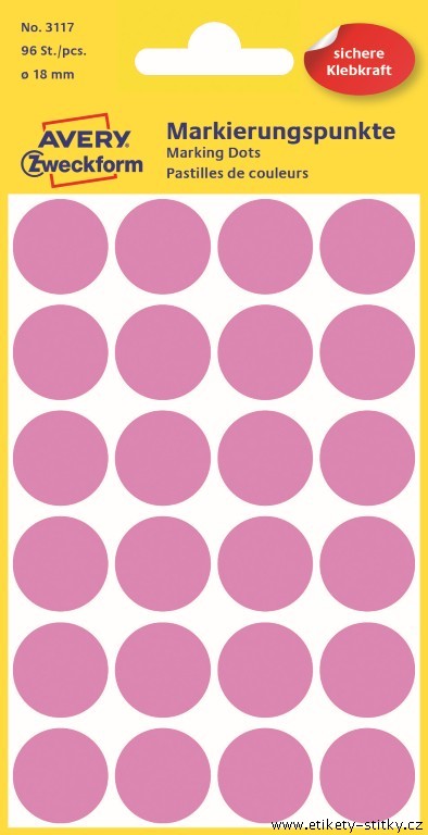 Samolepící kolečka Avery Zweckform 3117 na jednoduché a přehledné značení, uspořádávání, plánování, inventarizaci atd. Skvěle se hodí například pro plánování rozvrhů, směn nebo dovolených. Za pomoci kulatých značkovacích etiket Vám půjde práce lépe od ruky. Spolehlivá lepivost na všech běžných typech povrchů. Růžové samolepící etikety o průměru 18 mm Avery 3117 jsou ideální pro rychlé a snadné použití doma nebo v kanceláři. Nabízíme v různých barvách a velikostech!