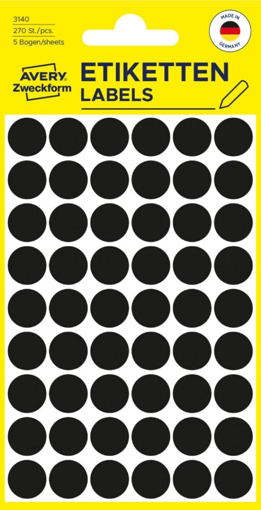 Samolepící kolečka Avery Zweckform 3140 na jednoduché a přehledné značení, uspořádávání, plánování, inventarizaci atd. Skvěle se hodí například pro plánování rozvrhů, směn nebo dovolených. Za pomoci kulatých značkovacích etiket Vám půjde práce lépe od ruky. Spolehlivá lepivost na všech běžných typech povrchů. Černé samolepící etikety o průměru 12 mm Avery 3140 jsou ideální pro rychlé a snadné použití doma nebo v kanceláři. Nabízíme v různých barvách a velikostech!