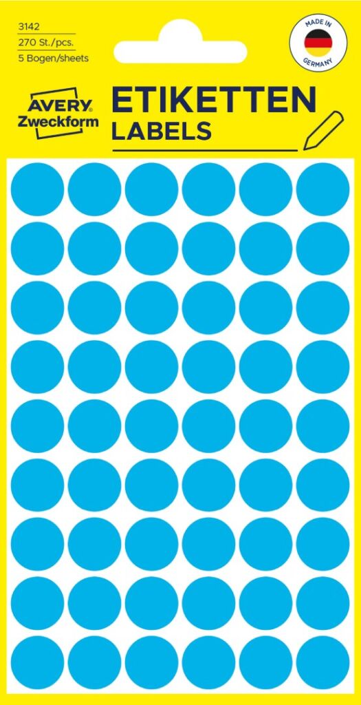 Samolepící kolečka Avery Zweckform 3142 na jednoduché a přehledné značení, uspořádávání, plánování, inventarizaci atd. Skvěle se hodí například pro plánování rozvrhů, směn nebo dovolených. Za pomoci kulatých značkovacích etiket Vám půjde práce lépe od ruky. Spolehlivá lepivost na všech běžných typech povrchů. Modré samolepící etikety o průměru 12 mm Avery 3142 jsou ideální pro rychlé a snadné použití doma nebo v kanceláři. Nabízíme v různých barvách a velikostech!