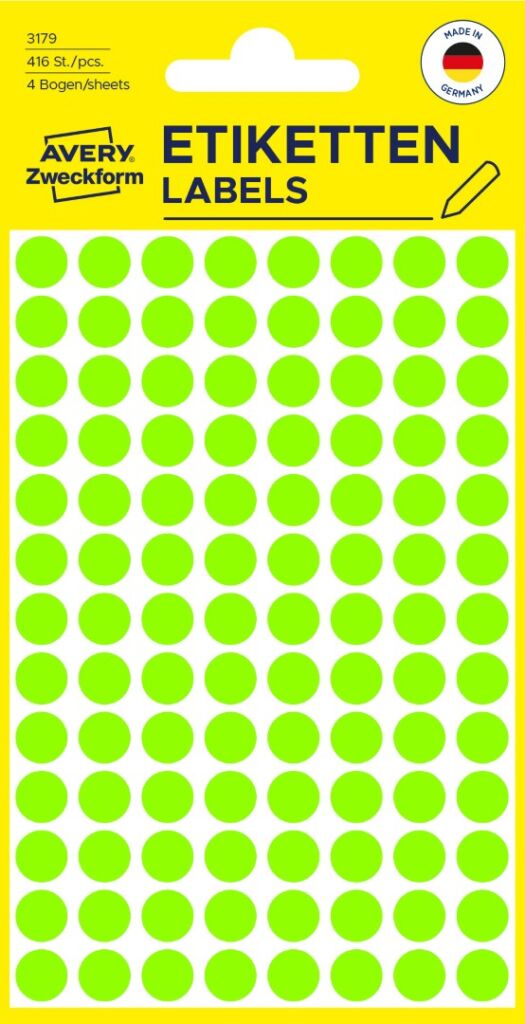 Samolepící kolečka Avery Zweckform 3179 na jednoduché a přehledné značení, uspořádávání, plánování, inventarizaci atd. Skvěle se hodí například pro plánování rozvrhů, směn nebo dovolených. Za pomoci kulatých značkovacích etiket Vám půjde práce lépe od ruky. Spolehlivá lepivost na všech běžných typech povrchů. Neonově zelené samolepící etikety o průměru 8 mm Avery 3179 jsou ideální pro rychlé a snadné použití doma nebo v kanceláři. Nabízíme v různých barvách a velikostech!