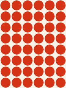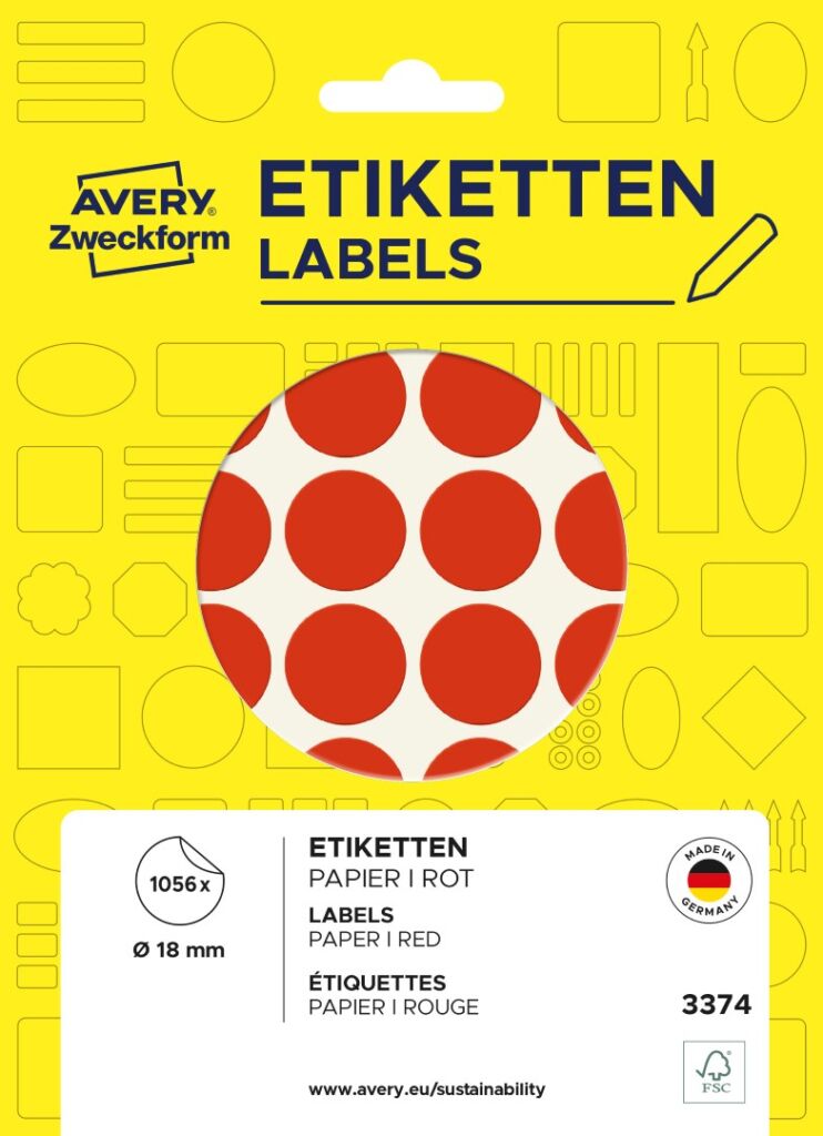 Samolepící kolečka Avery Zweckform 3374 na jednoduché, rychlé a poutavé označování, plánování, archivaci, organizaci, inventarizaci atd. Skvěle se hodí například pro plánování rozvrhů, směn nebo dovolených, označování konkrétních výrobků či dokumentů, kontrolu kvality nebo inventarizaci apod. Jsou okamžitě viditelné a umožňují tak jasný a jednoduchý přehled. Za pomoci kulatých značkovacích etiket Vám půjde práce lépe od ruky. Spolehlivá lepivost na všech běžných typech povrchů. Červené samolepky o průměru 18 mm Avery 3374 jsou ideální pro rychlé a snadné použití v kanceláři, obchodě nebo domácnosti, lze je také označit ručně, nejsou však vhodné pro potisk v tiskárnách. Kulaté samolepící etikety nabízíme v mnoha různých barevných i velikostních variantách pro velmi flexibilní použití.