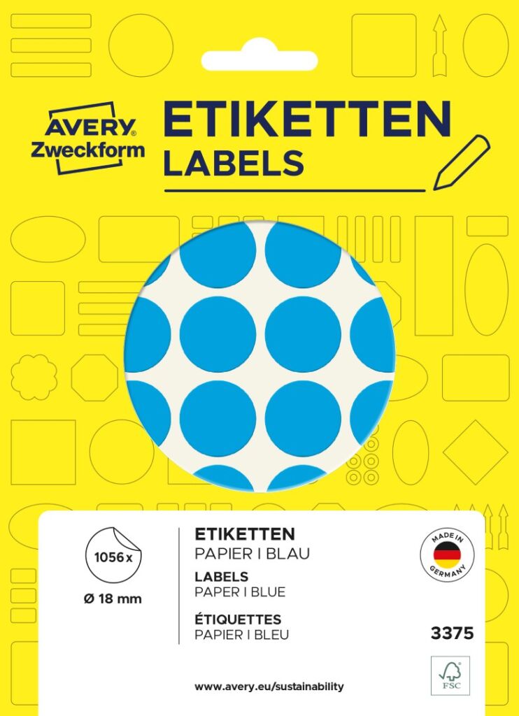 Samolepící kolečka Avery Zweckform 3375 na jednoduché a přehledné značení, uspořádávání, plánování, inventarizaci atd. Skvěle se hodí například pro plánování rozvrhů, směn nebo dovolených. Za pomoci kulatých značkovacích etiket Vám půjde práce lépe od ruky. Spolehlivá lepivost na všech běžných typech povrchů. Modré samolepky o průměru 18 mm Avery 3375 jsou ideální pro rychlé a snadné použití doma nebo v kanceláři. Nabízíme v různých barvách a velikostech!