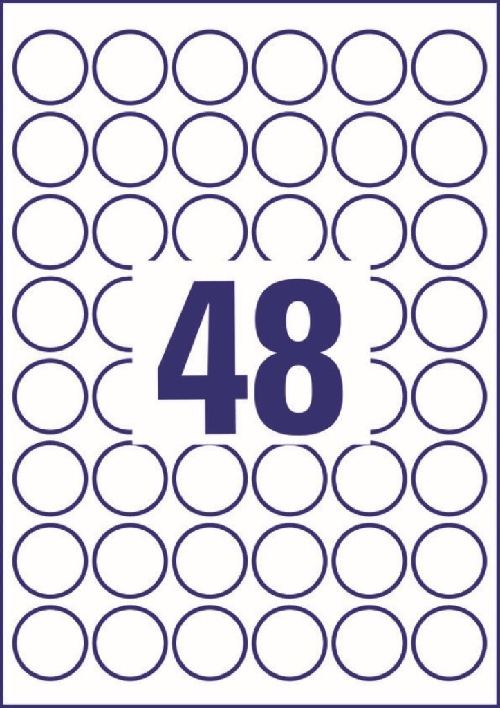 průměr 30 mm, 10 archů A4, 480 ks etiket v balení (48 ks/arch), papírové, permanentní lepidlo, barva bílá. Typ tiskárny: černobílá laserová, barevná laserová, inkoustová.